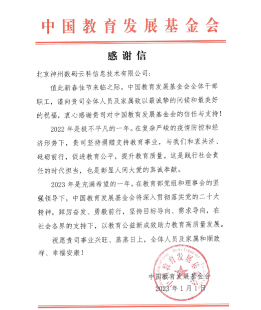 近期,K8凯发一触即发奥林匹斯之门 pp电子奥林匹斯之门收到中国教育开展基金会的感谢信,以感谢K8凯发一触即发奥林匹斯之门 pp电子奥林匹斯之门2022年在职业教育领域的贡献和实践,尤其是在全国职业院校大赛(中高职组)中对大赛顺利召开所付出的努力。